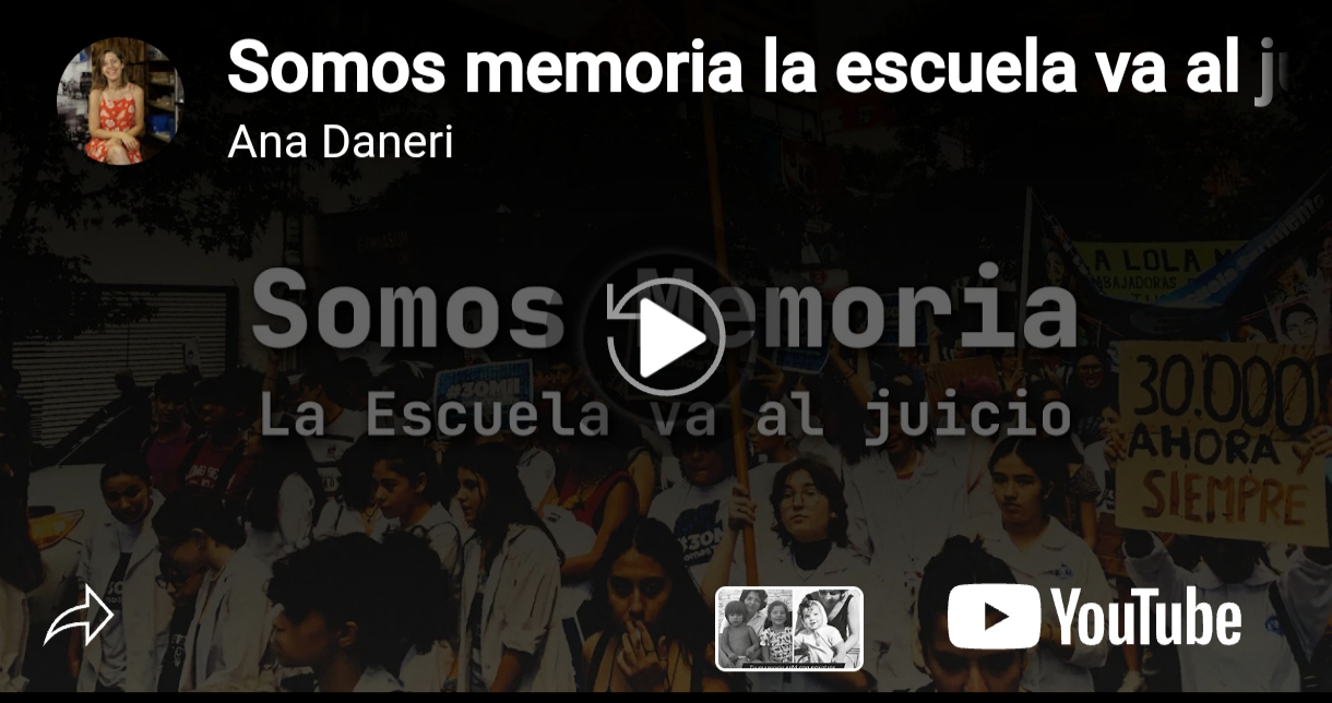 Este documental fue realizado con alumnas de la Escuela Sarmiento y la Lic. Roberta Marchese, que asistieron a las audiencias por juicios de lesa humanidad en la Megacausa “Jefatura III” durante 2023. Muestra su experiencia en el marco de una pedagogía de la memoria. Fue elaborado por la Lic. Ana Daneri, en el marco del PIUNT  H7/33: “Cuestiones sobre juventud (es) en contextos educativos, literarios y comunicativos) dirigido por la Dra. María Gabriela Palazzo de la Facultad de Filosofía y Letras (UNT)