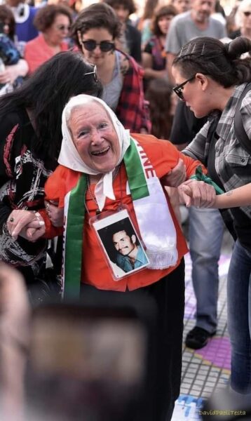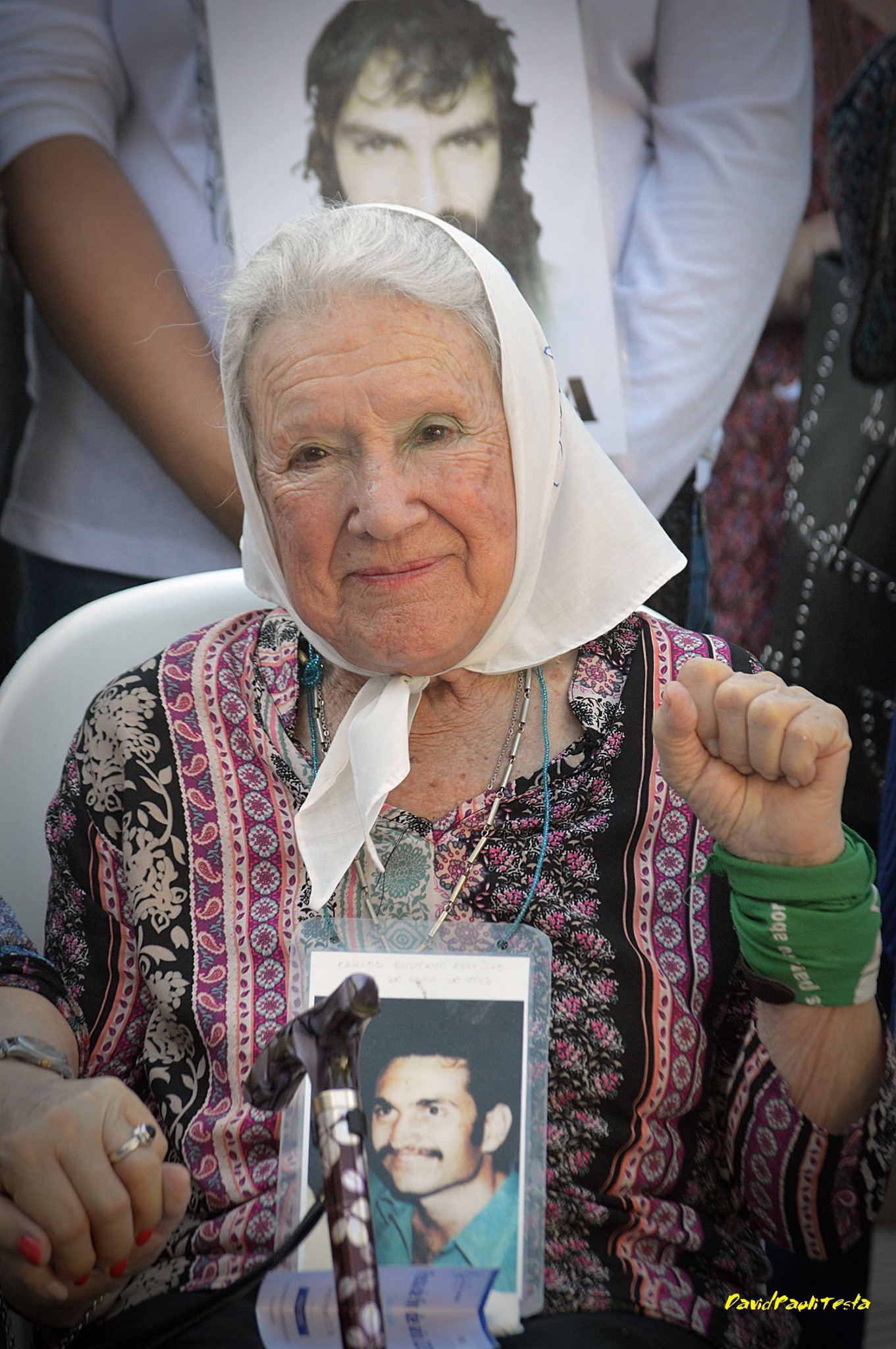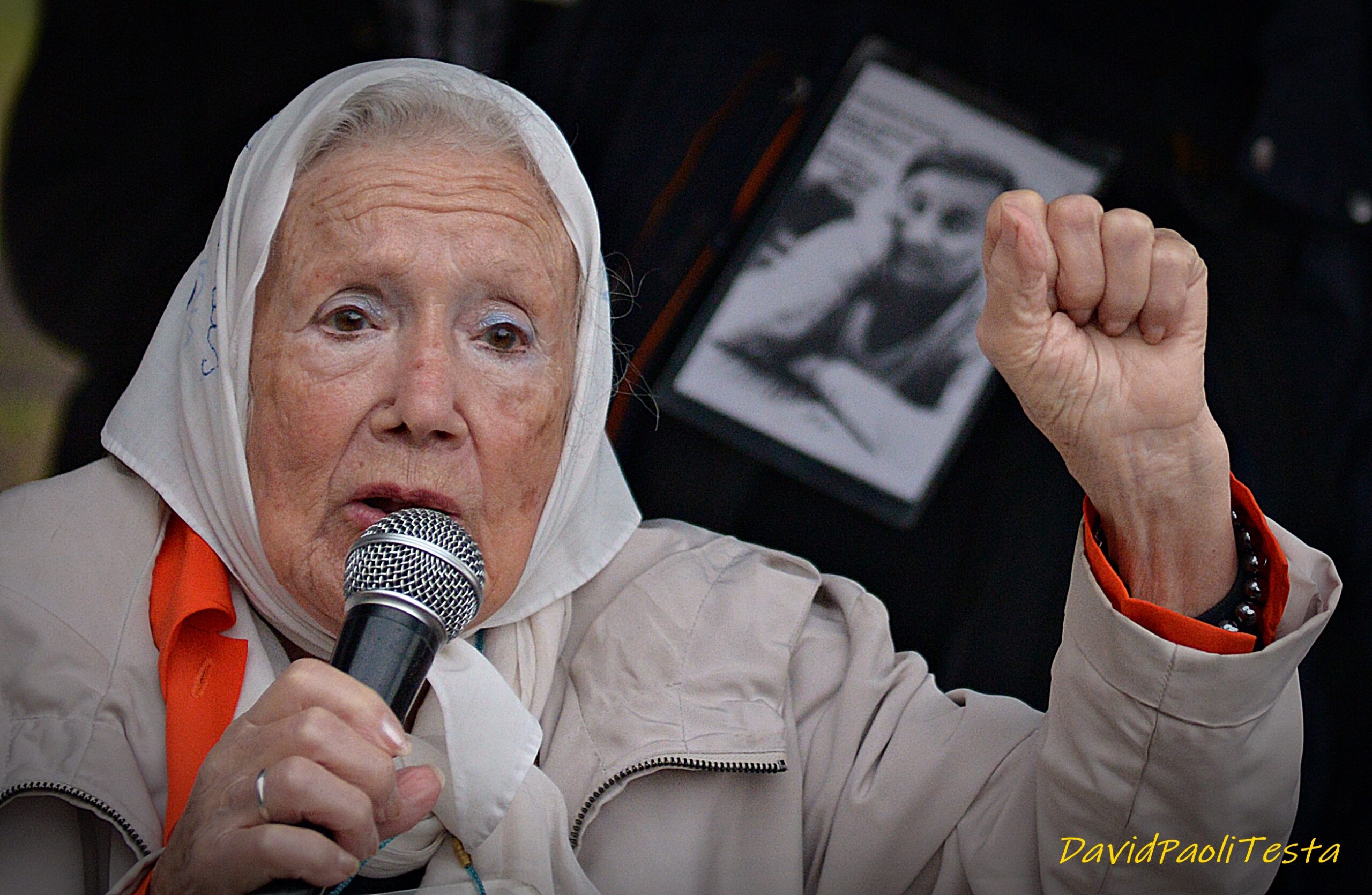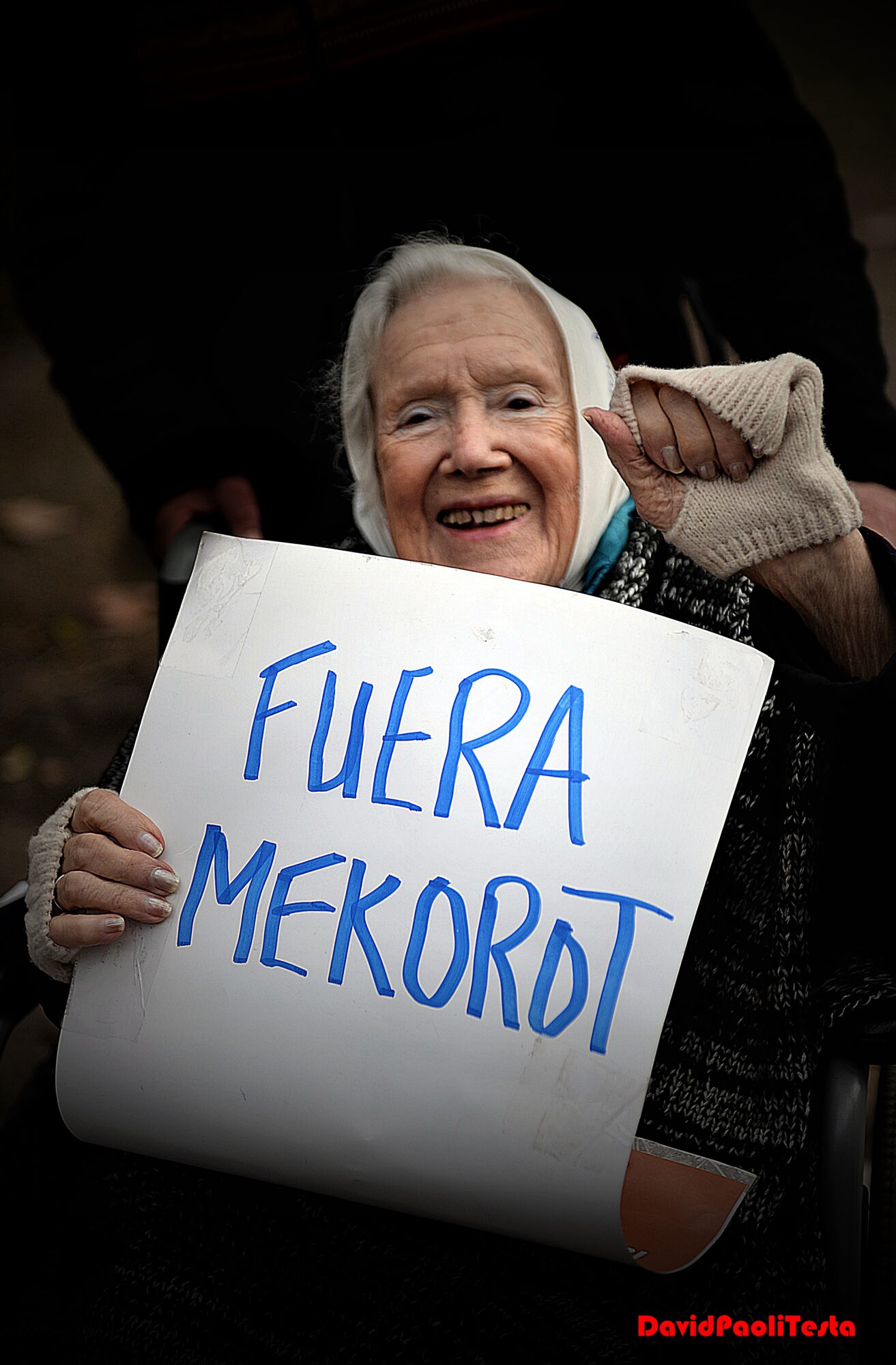 ¿Por qué una muestra fotográfica de Nora Cortiñas?. Decía R. Walsh: Las clases dominantes siempre han procurado que los trabajadores no tengamos historia, no tengamos doctrina, no tengamos héroes, ni mártires. Cada lucha debe empezar de nuevo, separada de las luchas anteriores. La experiencia colectiva se pierde, las lecciones se olvidan. La historia aparece así como propiedad privada cuyos dueños son los dueños de todas las cosas…. Este es un pequeño ejercicio para no perder La Memoria. Norita dejó de ser un ama de casa, que con sus hermanas cosía para afuera, en el mismo momento en el que secuestraron a su hijo Carlos Gustavo Cortiñas, de 24 años, el 15 de abril de 1974. Si la buscamos en Google aparece primero como militante de DDHH antes que como Madre de Plaza de Mayo, ella entendió perfecta y rápidamente que el enemigo era el capitalismo y todas sus máscaras partidarias, que una lucha no podía estar escindida de las otras. Por eso la vemos, en estas humildes fotos, encabezando la pelea por el agua, contra Mekorot, por la legalización del aborto, de la marihuana, por los mapuche, contra los travesticidios… pero también comprendió el Internacionalismo en las luchas y se la puede encontrar defendiendo a Palestina del sionismo, a Ecuador, a los presos políticos de Paraguay, viajando a Chiapas, Colombia, Venezuela, Bélgica donde recibió un Doctorado Honoris Causa , Japón, Kurdistán, Honduras, el Sahara Occidental, Haití…Suelen decirnos que la generación del hijo de Norita, de mis padres, de los 30.000 fue derrotada, que sus sueño de un mundo mejor de canceló. El simple hecho de que ustedes estén ahí, tal vez pensando que no todo se compra o se vende, nos demuestra que no fue así.