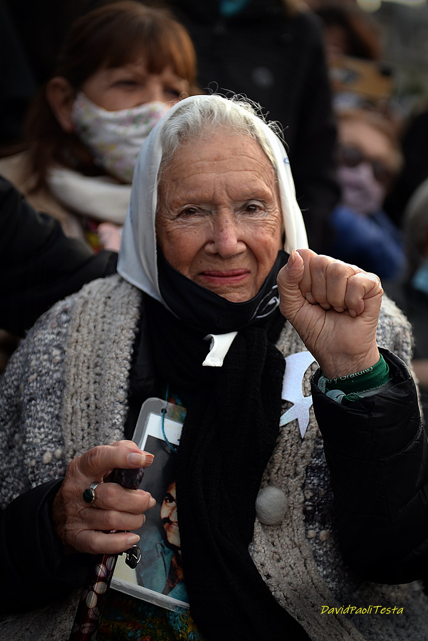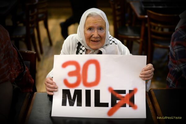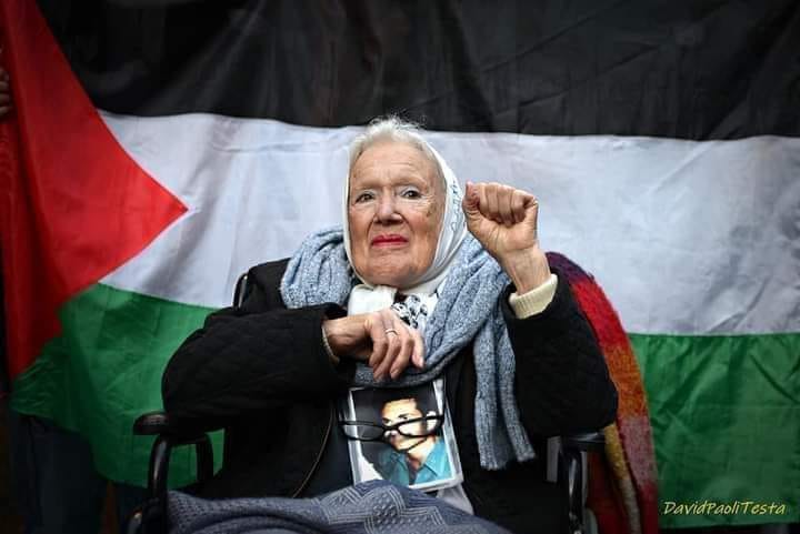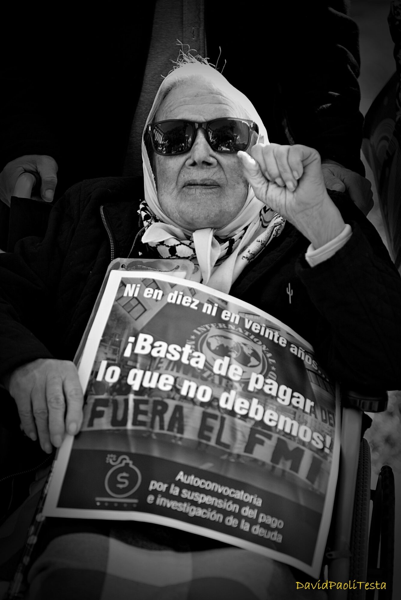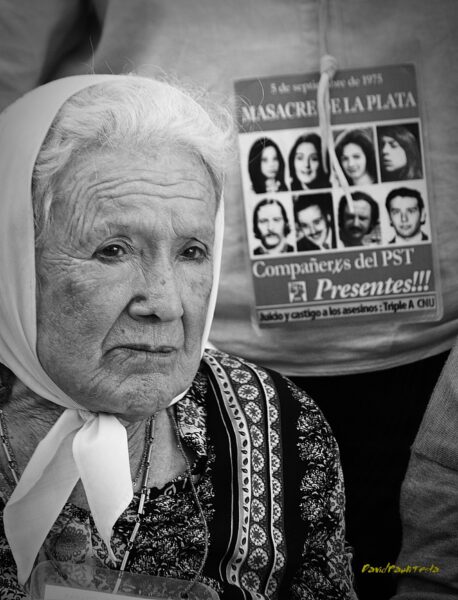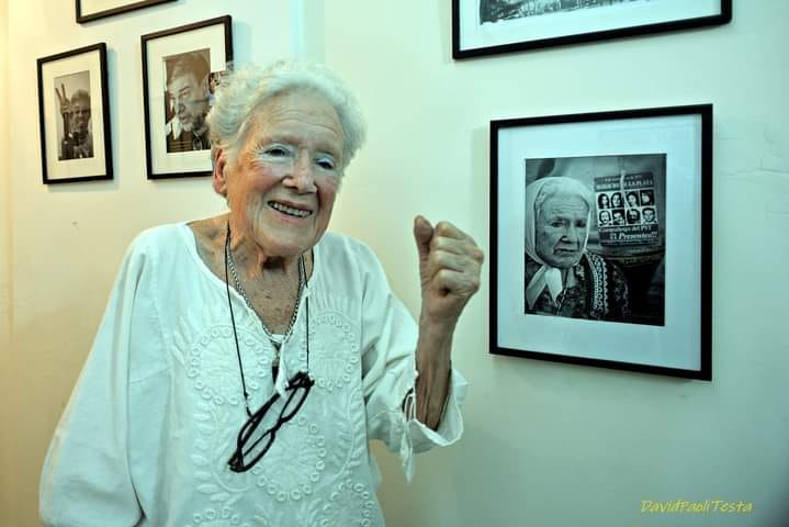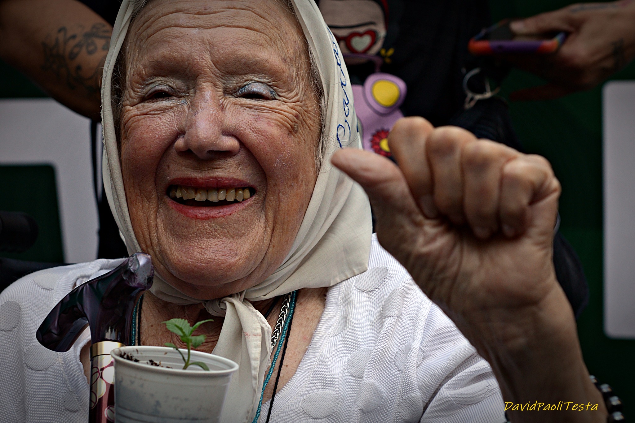¿Por qué una muestra fotográfica de Nora Cortiñas?. Decía R. Walsh: Las clases dominantes siempre han procurado que los trabajadores no tengamos historia, no tengamos doctrina, no tengamos héroes, ni mártires. Cada lucha debe empezar de nuevo, separada de las luchas anteriores. La experiencia colectiva se pierde, las lecciones se olvidan. La historia aparece así como propiedad privada cuyos dueños son los dueños de todas las cosas…. Este es un pequeño ejercicio para no perder La Memoria. Norita dejó de ser un ama de casa, que con sus hermanas cosía para afuera, en el mismo momento en el que secuestraron a su hijo Carlos Gustavo Cortiñas, de 24 años, el 15 de abril de 1974. Si la buscamos en Google aparece primero como militante de DDHH antes que como Madre de Plaza de Mayo, ella entendió perfecta y rápidamente que el enemigo era el capitalismo y todas sus máscaras partidarias, que una lucha no podía estar escindida de las otras. Por eso la vemos, en estas humildes fotos, encabezando la pelea por el agua, contra Mekorot, por la legalización del aborto, de la marihuana, por los mapuche, contra los travesticidios… pero también comprendió el Internacionalismo en las luchas y se la puede encontrar defendiendo a Palestina del sionismo, a Ecuador, a los presos políticos de Paraguay, viajando a Chiapas, Colombia, Venezuela, Bélgica donde recibió un Doctorado Honoris Causa , Japón, Kurdistán, Honduras, el Sahara Occidental, Haití…Suelen decirnos que la generación del hijo de Norita, de mis padres, de los 30.000 fue derrotada, que sus sueño de un mundo mejor de canceló. El simple hecho de que ustedes estén ahí, tal vez pensando que no todo se compra o se vende, nos demuestra que no fue así.